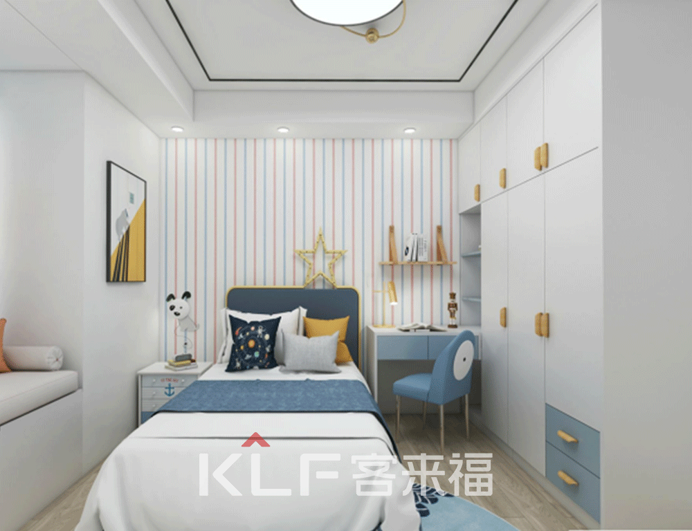 看完客廳往更深處來就是夫妻二人的主臥,以及兒童房了。主臥中冷色調(diào)以及暖色調(diào)的搭配,使得房間看起來更加溫馨,因?yàn)榉块g內(nèi)有一個(gè)大轉(zhuǎn)角,所以我們用整體式衣柜設(shè)計(jì),將這個(gè)轉(zhuǎn)角藏了起來。但也因禍得福,讓房間更具有空間的美感,同時(shí)還增加了收納空間。兒童房的設(shè)計(jì)采用了簡潔的童話風(fēng),讓房間內(nèi)的色彩更加豐富,活潑鮮艷。