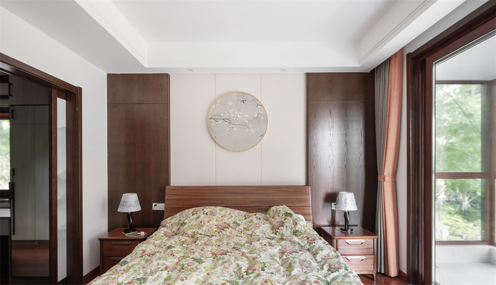 主臥處背景與床單的花紋配色透露出一股春天的和煦美好。背景墻上的重視掛畫,蜿蜒生長的枝條,成群飛翔的燕子展現(xiàn)出自然的生機。右側帶了一個陽臺,外面枝葉茂盛,樹葉搖動,臥室被綠意包圍。