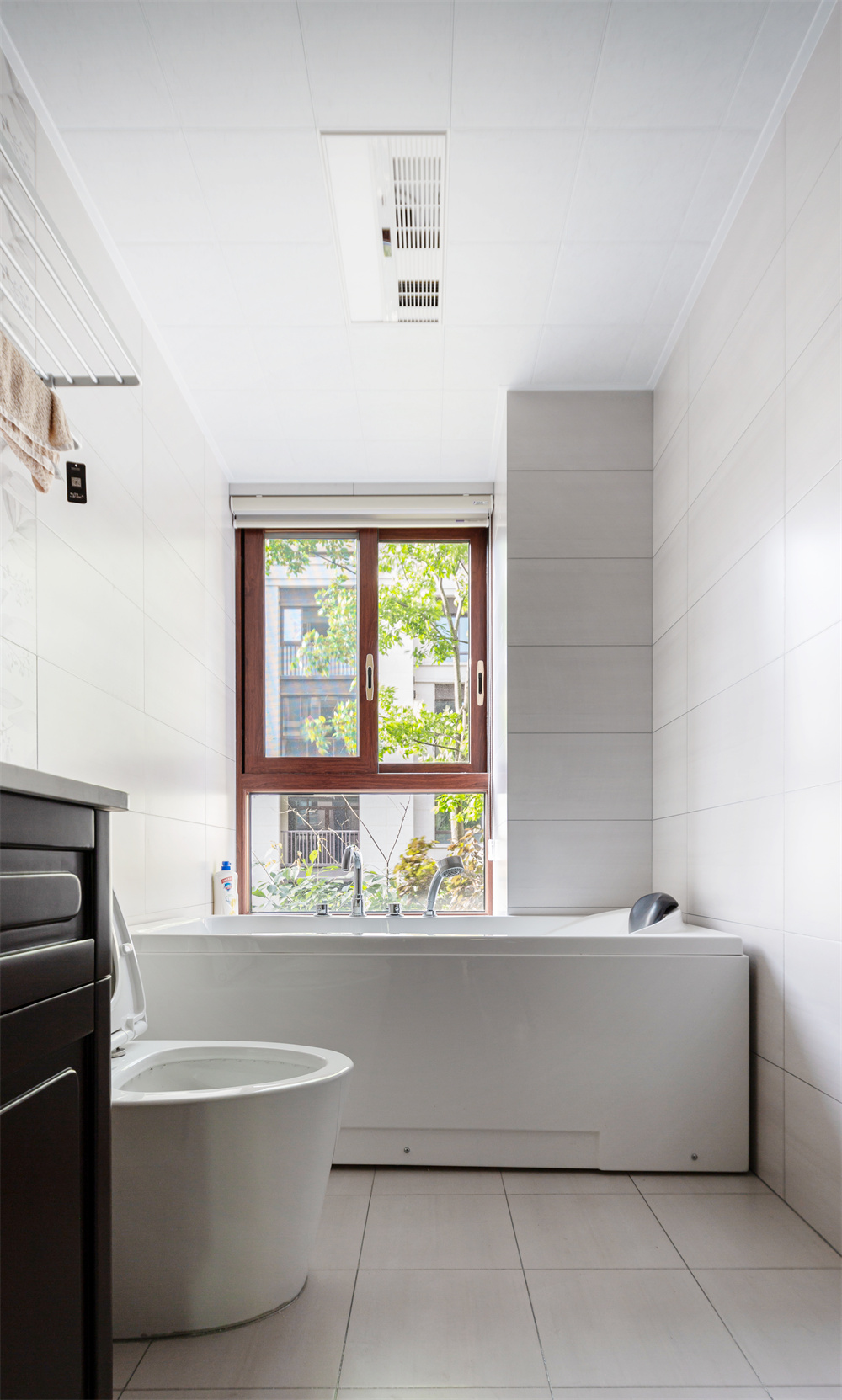 浴室中依舊是中雅胡桃色的窗戶邊框。白色給人的感覺非常干凈利落,在窗戶頂做了抽拉式百葉窗的設計,便于在洗漱時窗簾的拉起和放下,手動的也更能增加體驗的感覺。