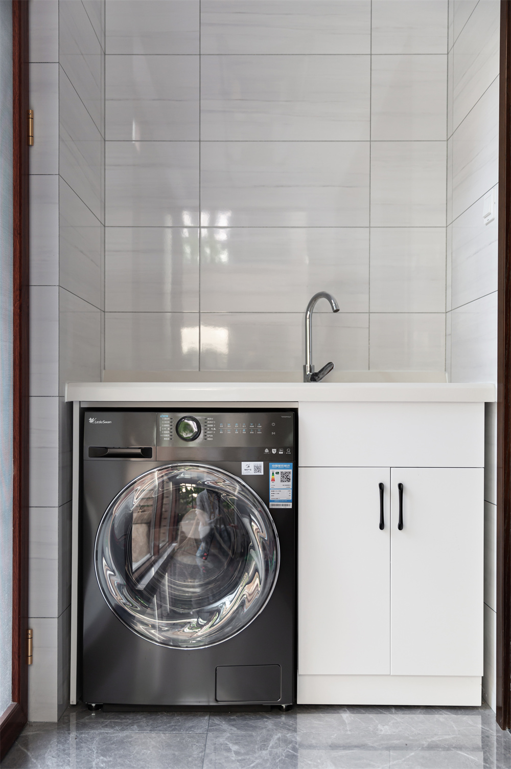主要的陽臺位于一樓,從陽臺就可拉開門進入自帶的小院。陽臺處裝修的十分簡單,極簡的白色洗衣機柜,地面是與客廳處一脈相連的灰色系地磚,簡簡單單不會削弱中式風格的基調。大部分戶型都會在陽臺處做洗衣機柜,不僅節(jié)省裝修空間,而且美觀大氣。