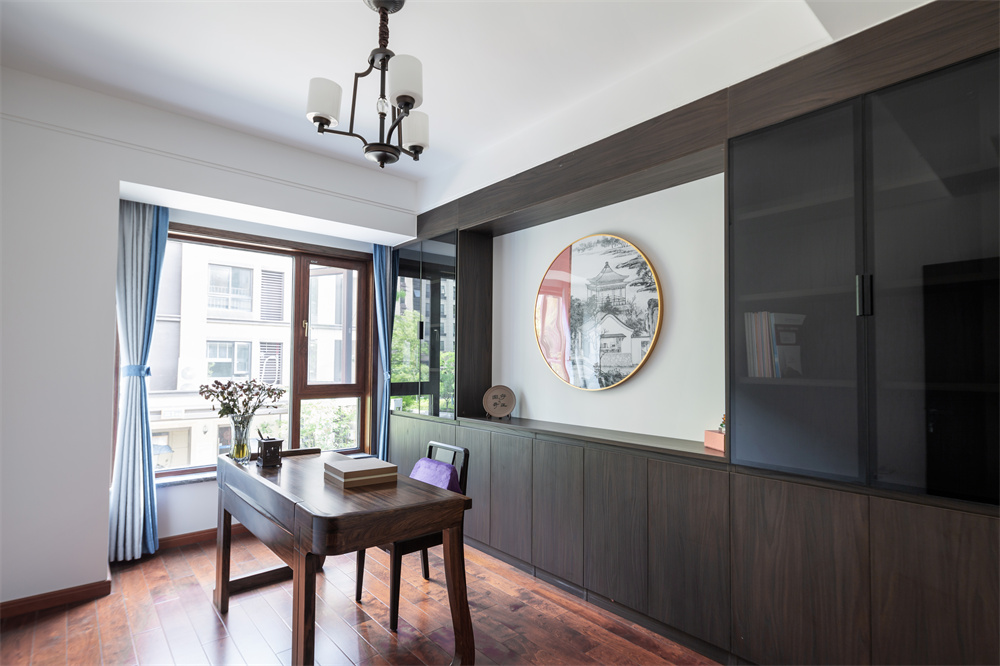 書房是屋主特地為愛人準備,便于愛人日常辦公的需求,特地選取了一間風景優(yōu)美的房間作為工作區(qū)域。仿佛如黃鶴樓般的裝飾畫,處處透露出濃郁的中式風。茶色的玻璃柜可以映照出窗外的景色,在這里辦公非常安靜,可以集中精力思考處理事務。