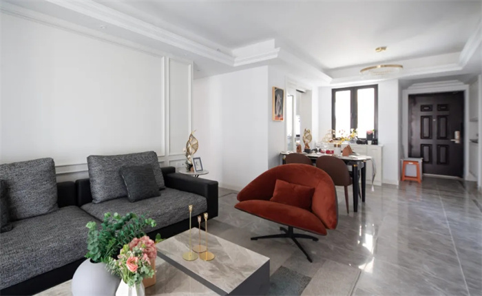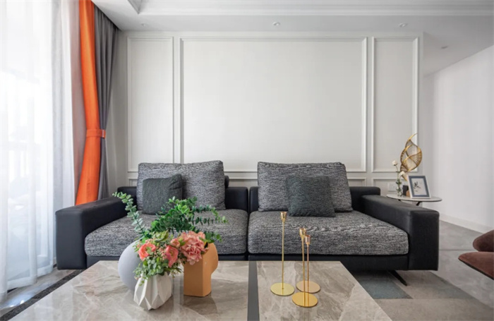 灰色皮質(zhì)沙發(fā)一眼望去便能感受柔軟的觸感,白色的茶幾下方鋪上地毯,給輕奢增加一絲不尋常的味道,冬天可以把地毯抽出去孩子在上面玩耍,但是記得要及時(shí)打理。