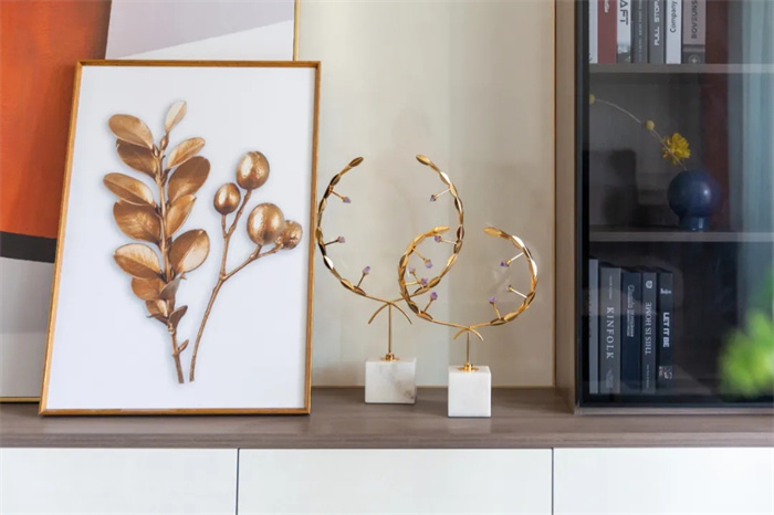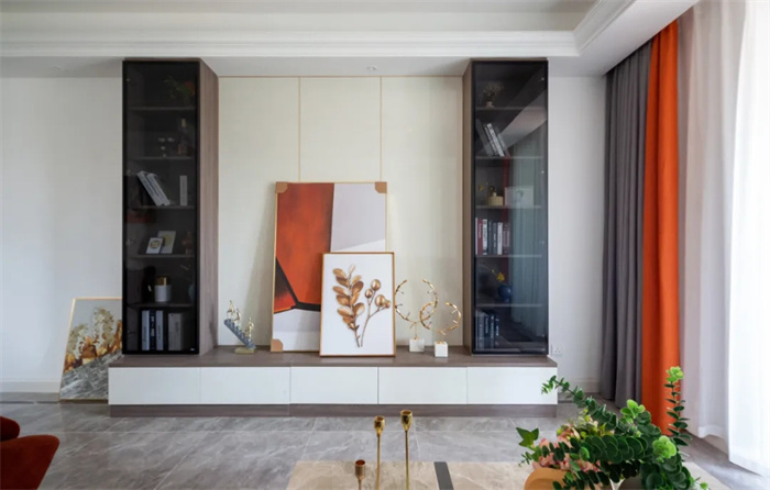 因?yàn)殡娨暀C(jī)未到所有在電視柜上方擺上掛畫(huà)以裝飾。電視柜上方兩側(cè)對(duì)稱(chēng)分布著書(shū)柜,日常放放書(shū)和獎(jiǎng)杯獎(jiǎng)狀??紤]到電視柜長(zhǎng)度和寬度的問(wèn)題,如果只放電視機(jī)會(huì)有些空蕩,書(shū)柜的打造提供收納功能,也讓整體更加飽滿。