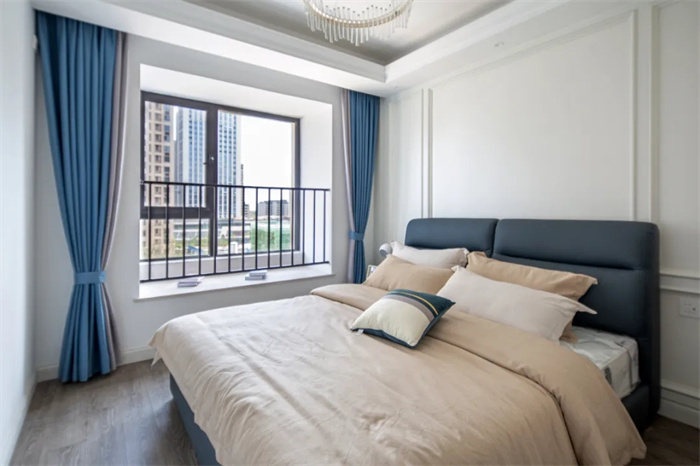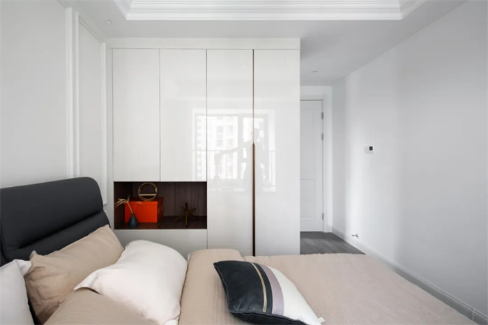 臥室采用膜壓板背景墻,石膏線給背景墻增加層次感。飄窗處安置了護(hù)欄,為孩子的安全保駕護(hù)航。整面的衣柜處在左側(cè)做了鏤空,給白色增加點(diǎn)質(zhì)感,顯得小巧又實(shí)用。