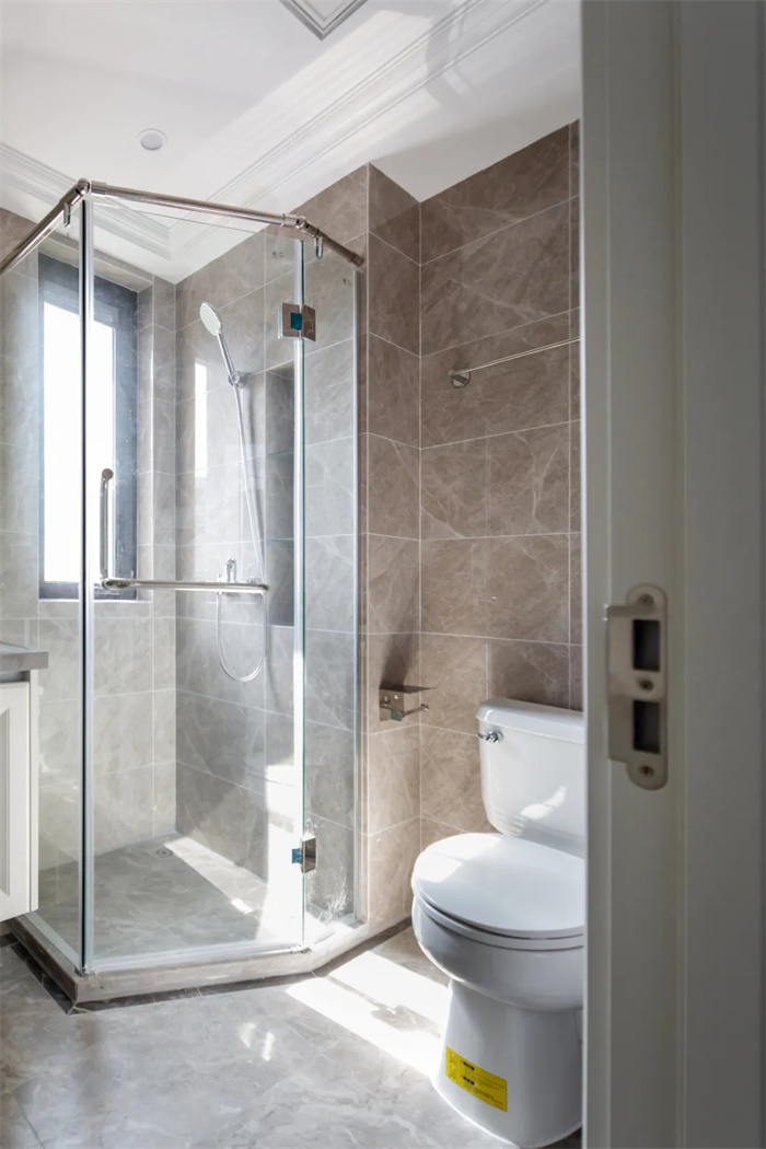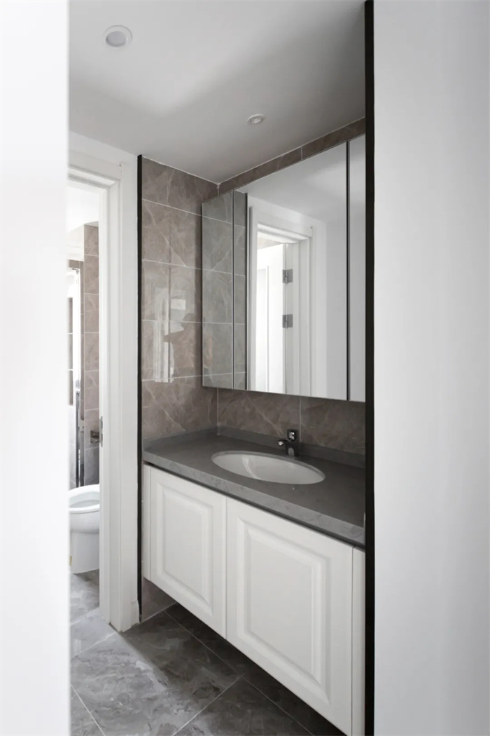 衛(wèi)浴處下方先是芬蘭白膜壓門(mén)板,里處打造半包圍形的淋浴間,下方踢腳線抬高避免水流的流出,整體衛(wèi)浴間做到了干濕分離。