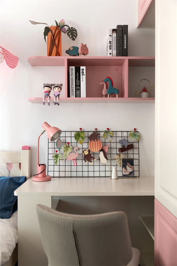 由于戶主家有個(gè)小女孩,所以在顏色搭配上選擇了粉粉嫩嫩的粉色,與白色中和,整體十分柔和,仿佛掉進(jìn)糖果蜜罐里。床上放置了一些娃娃,也是非常用心了。