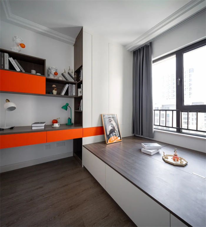 此間臥室的床鋪采用榻榻米的設(shè)計(jì),床上方可以自如掀開(kāi)儲(chǔ)放雜物。整體空間選用最亮眼的橘色搭配不沖突的橡木紋,在視覺(jué)上給人以沖擊感。書(shū)桌上方安置吊柜,留出一段距離不至于顯得擁擠。