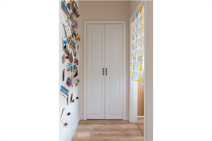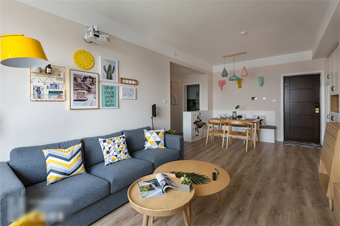 進入客廳,首先映入眼簾是簡約的白色立柜和一組照片墻的設(shè)計。每一張照片仿佛都在述說一個故事,記錄這個95后小夫妻每個難忘的瞬間??蛠砀6ㄖ频姆姨m白入戶柜和木門在照片墻的陪襯下溫馨感十足。撞色的沙發(fā),簡潔明快的亮黃色搭配深灰色立體感拉滿,駝色墻面上的藝術(shù)畫交錯搭配,透露著一絲文藝氣息。