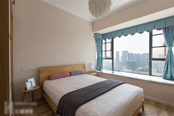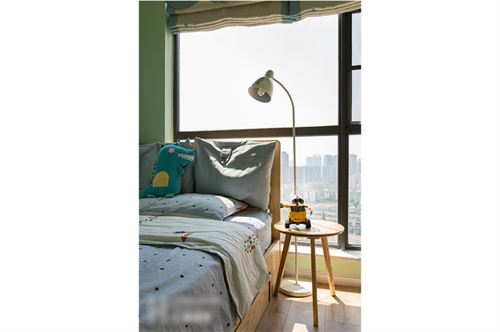 主臥的設(shè)計從實用性出發(fā),白色的衣柜和墻面形成一體,顯得生氣十足;在床頭柜的選擇上也是遵從屋主追求自然的理念,原木床體,搭配設(shè)計感十足的幾何造型床頭燈,渲染出濃濃的自然氣息。湖藍(lán)色的飄窗無不在表達簡約、舒適的生活主題。“當(dāng)清晨的第一縷陽光透過窗簾的縫隙擠進來,余生,我想把日子過成自己想要的模樣?!?/span>