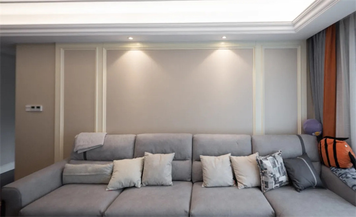 灰色系的沙發(fā),米色系的抱枕,暖黃色的射燈營造溫馨的家庭氛圍,回到家后躺在沙發(fā)即可享受此刻的柔軟。柔和的棕色與米白色的石膏線背景墻打造仿佛融為一體,同樣是對稱的設(shè)計(jì)與電視背景墻相呼應(yīng)。如果感覺背景墻有些單調(diào),可以掛上長方形的掛畫來增加空間內(nèi)的豐富性和層次感。
