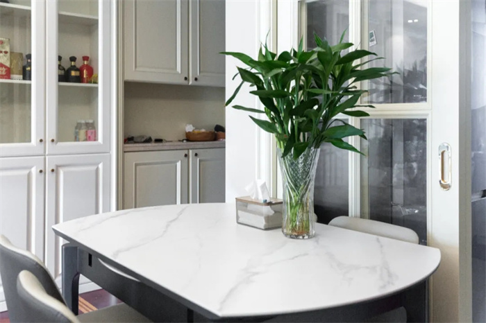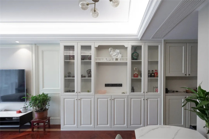 左側(cè)便是與玄關(guān)柜相連的餐邊柜,餐邊柜集酒柜、收納柜的功能于一體,最大限度發(fā)揮出產(chǎn)品的使用價(jià)值。芬蘭白的門板顏色與透亮的玻璃相搭配,不需要額外給物品增加神秘感,想要的東西拉開柜門便可以拿到。餐邊柜中間部分上方的圍欄設(shè)計(jì),放置石膏雕像增加空間內(nèi)的藝術(shù)感。