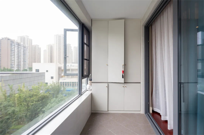 整個(gè)陽臺(tái)具有一定的長度,在另一側(cè)打造成多功能儲(chǔ)物區(qū)。門板顏色光澤度高,手感溫和,耐磨損耐用,在陽臺(tái)處改造成為休閑區(qū),放上桌椅板凳。眺望窗外即可獲得片刻的休閑。