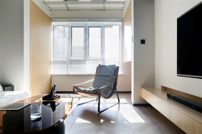 以白、灰、原木為主要色系,搭配千鳥格紋和愛馬仕橙,賦予整個空間復古簡約的濃郁氣息,從客廳透過的陽光,透過百葉窗劃分為細碎的觀影投射在木地板上,格外閃亮。