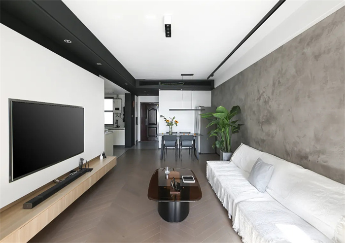 電視背景墻沒有做整面的內(nèi)嵌式的電視柜,考慮到客廳內(nèi)的整體面積和空間展示,以整面的大白墻打底更符合極簡主義的特點,在電視柜的內(nèi)部安裝了燈帶,夜晚看電視的時候也能多一份溫馨。