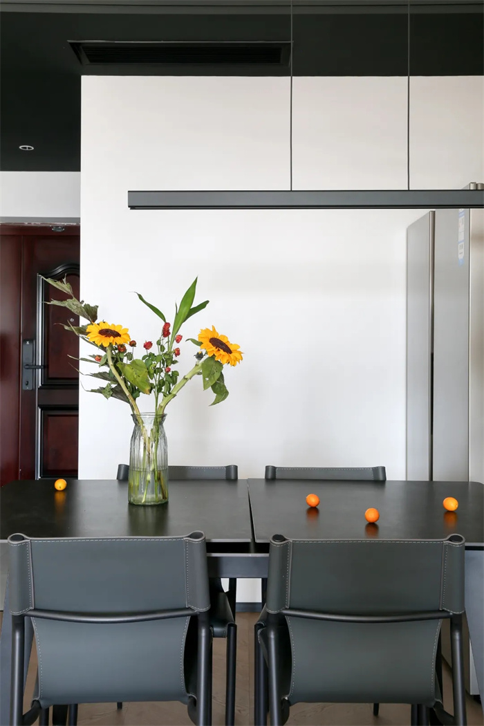 水泥灰的餐桌透露出滿滿的工業(yè)風設計,桌上擺放新鮮的花束,業(yè)主時不時會購買新鮮的花束擺放在餐桌上,展現(xiàn)出對美好生活的精準向往。