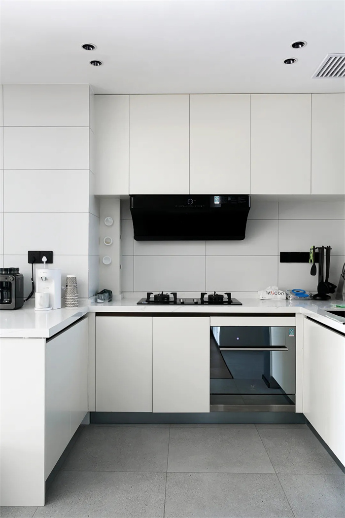 廚房在進門的右側(cè)打造出了U字型的空間布局,類似于公寓性質(zhì)的開放性廚房,在玄關延伸出一部分墻體,在廚房格局的左側(cè)延伸一部分可以作為島臺使用,形成完整的廚房空間。