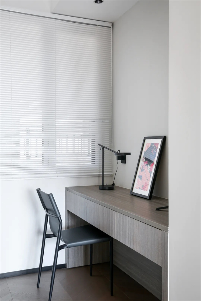 次臥同樣是采用整面到頂?shù)囊鹿瘢钆浜谏拈L條把手,靠墻的一側(cè)打造成開放收納格的設計,延伸的桌面下方放了暖風機等設備,次臥格局雖不大,勝在簡約。