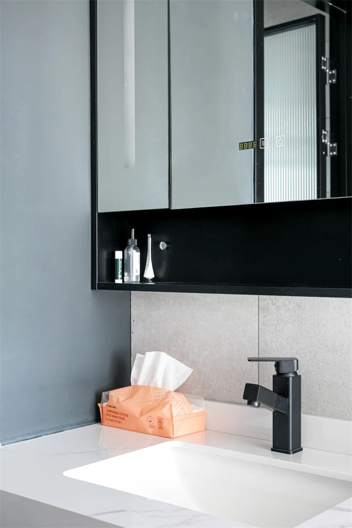 玄關處的柜體采用兩開門的樣式,中間部分內(nèi)置燈帶鑰匙、快遞、裝飾物便于查找。下方留出空間用于放置日常在家穿的拖鞋。