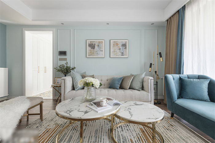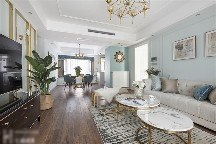 1、全屋以淺藍為主色調,輕奢金色、墨藍色做點綴,搭配精致燈具和美式軟裝,簡約中不乏浪漫精致;
