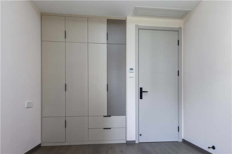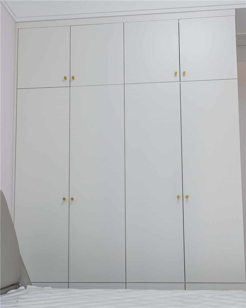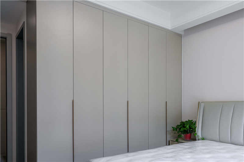 主臥室作為屋主的休息區(qū),整體更強調(diào)收納性和舒適度,采用茶白的色彩與全屋白色系更適配,一門到頂?shù)恼乓鹿癫捎玫氖且蛔中屯w拉手,方便使用。