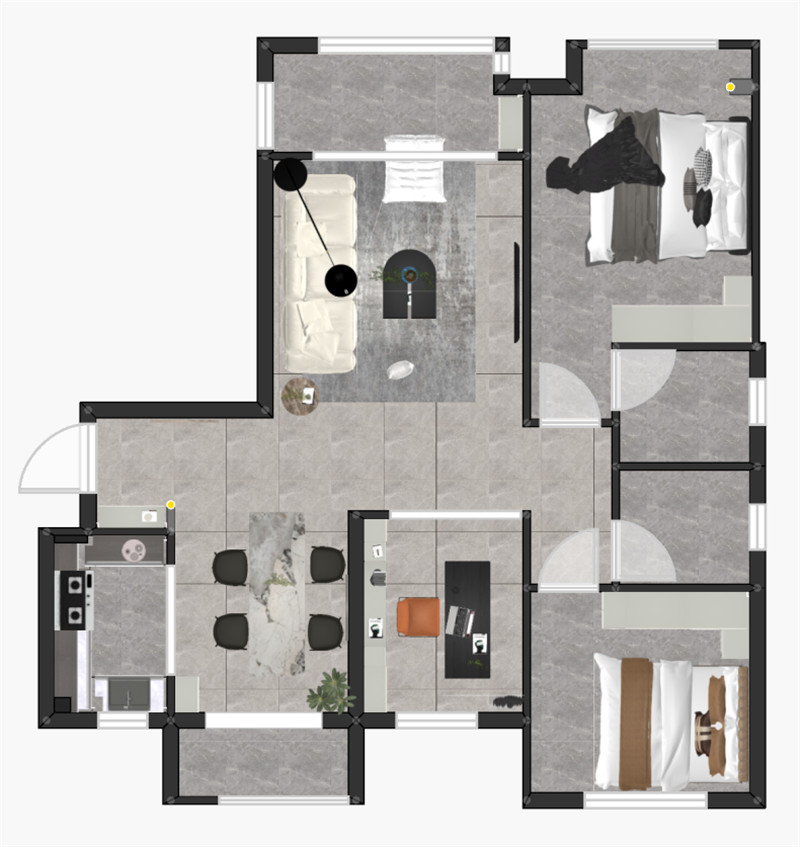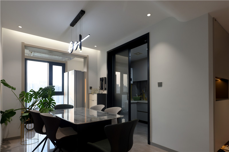 有室有食,簡(jiǎn)單幸福。堅(jiān)守功能主義的理念,以結(jié)構(gòu)為入眼點(diǎn)布局色彩、設(shè)計(jì),使得動(dòng)線明晰;蘭迪灰門板與黑色調(diào)的中和,簡(jiǎn)約又不失大氣感。