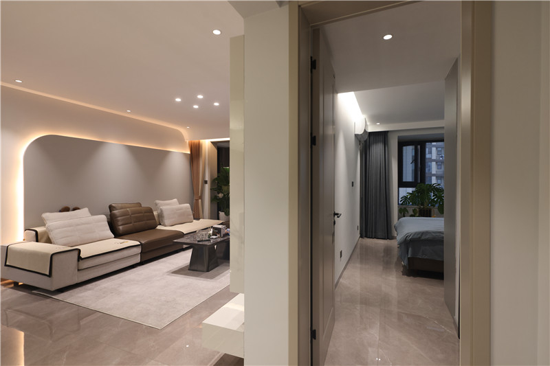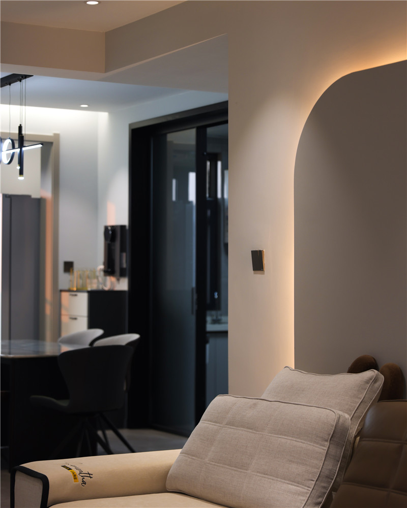 秉承現(xiàn)代簡(jiǎn)約的高定思維,以水灰及茶白為基調(diào),用圓弧線條綜合布局,輔之以燈光調(diào)和,讓整體空間自然溫柔,卻暗藏一絲恢弘之意。