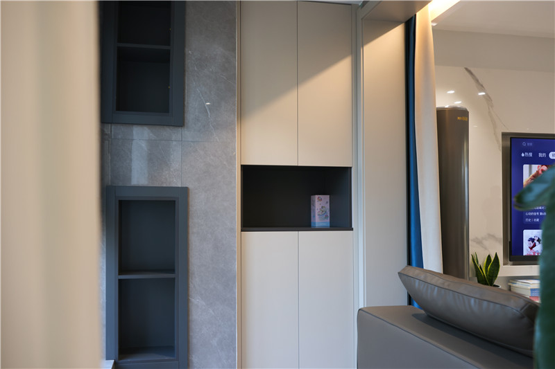 電視背景墻為大理石紋,將電視機(jī)整體嵌入,視覺(jué)延展;底柜整面抬高做懸浮設(shè)計(jì),是收納柜,頂部擺上裝飾物不在話下,這立體感也是讓人愛了。