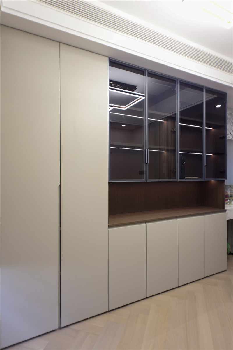 在沙發(fā)背景一側(cè),我們用一組島臺(tái)與餐桌的設(shè)計(jì)形成空間上的劃分,沿著墻壁走勢(shì)設(shè)計(jì)的酒柜與次臥門(mén)齊平,這樣整體做嵌入式的柜體收納會(huì)讓空間顯得更輕盈。半透茶色玻璃柜門(mén)也很好地展示了藏酒與工藝品,彰顯屋主的生活格調(diào)。