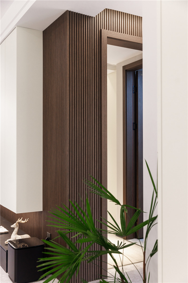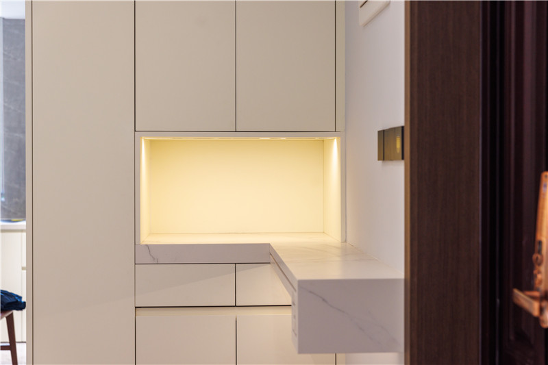 在玄關(guān)為了提升空間利用率,我們采用了嵌入式的柜體進(jìn)行上下分區(qū)收納。中部掏空后延伸大理石臺(tái)面作為置物臺(tái),放置一些小物品都很實(shí)用。
