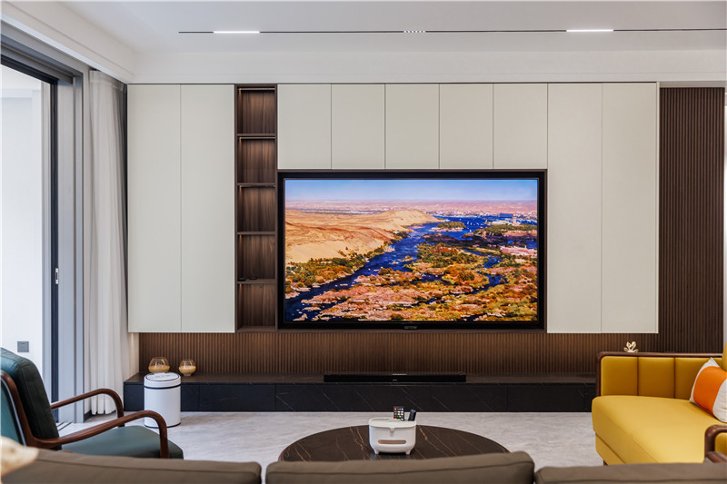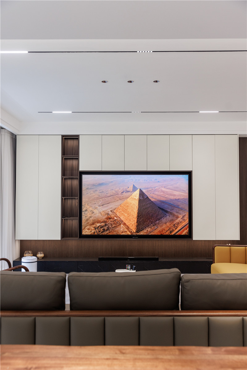 圍合式的空間布局里,電視柜成為環(huán)境的主角,以納科榆木打底,再以芬蘭白柜體進(jìn)行生活收納。