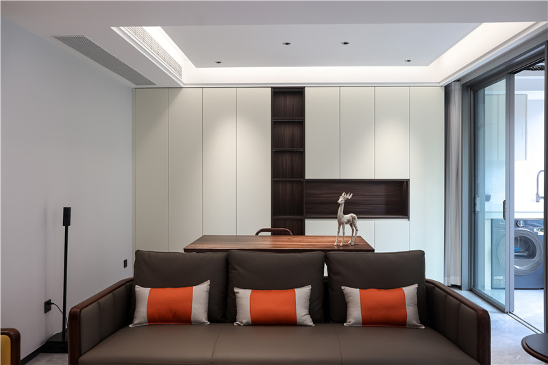 聽風(fēng)吟,賞葉落??拷年?yáng)臺(tái)的空間里我們將其設(shè)計(jì)為一個(gè)開放休閑區(qū),無(wú)論是想在這里辦公閱讀還是做手工、喝茶都是不錯(cuò)的選擇。榆木柜體的紋理清晰可見(jiàn),搭配純凈的白色通頂柜,帶來(lái)一絲禪意,令人松弛神往。