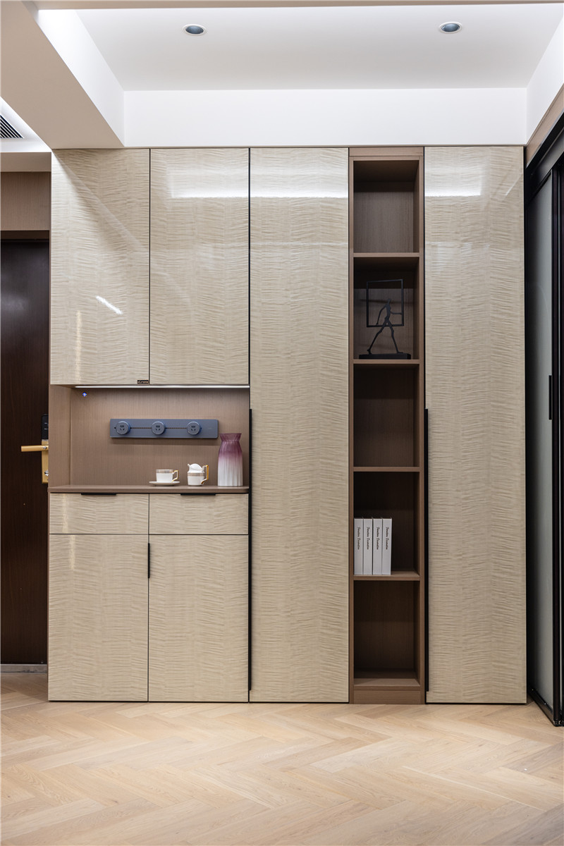 門板為楓影超晶板,亮光屬性與光影配合,為空間增色;中部預(yù)留掏空、整面窄立隔板為開放式構(gòu)造,是小物件、裝飾物的存放地。