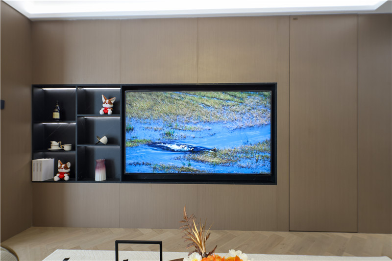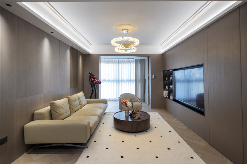 電視背景墻為科技直紋,電視機、裝飾柜深調(diào)嵌入,以視覺差突出美感;沙發(fā)背景墻科技直紋+水漆科技銀梨+柵格設(shè)計+射燈,拼接式彰顯智慧;硬裝與軟裝相輔相成,雅致大氣。