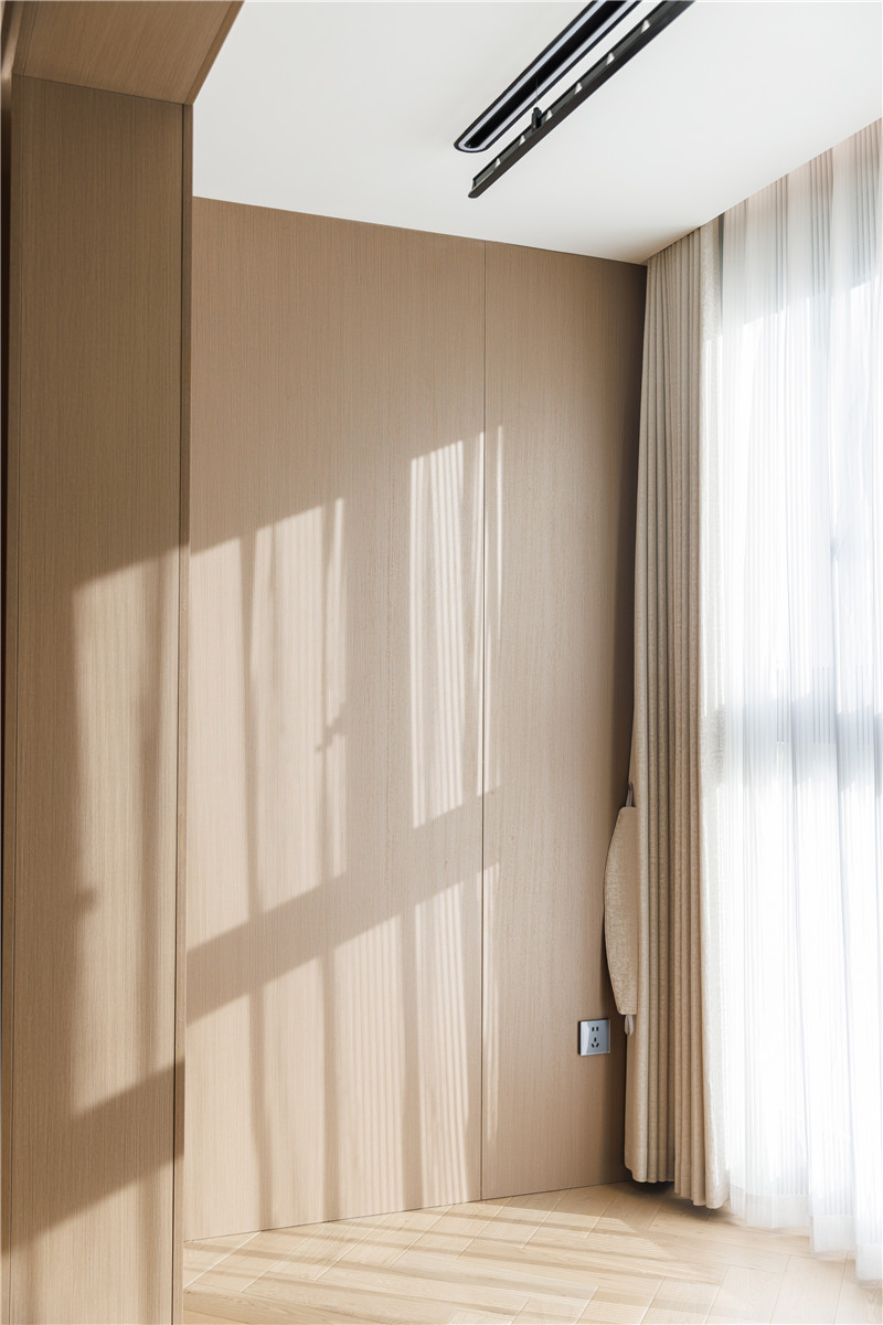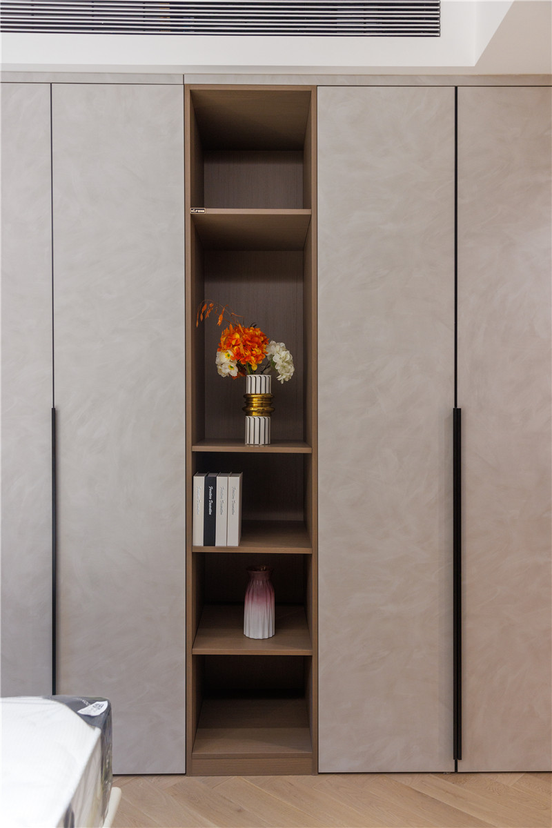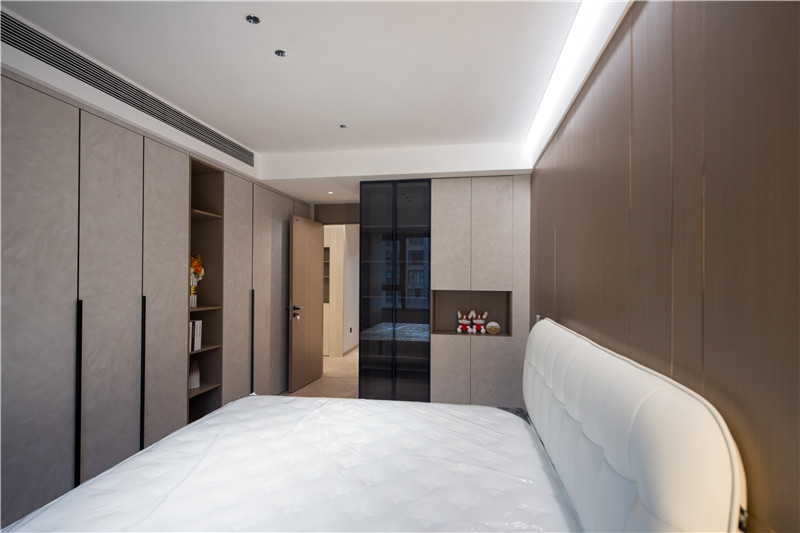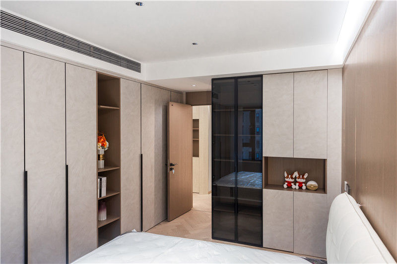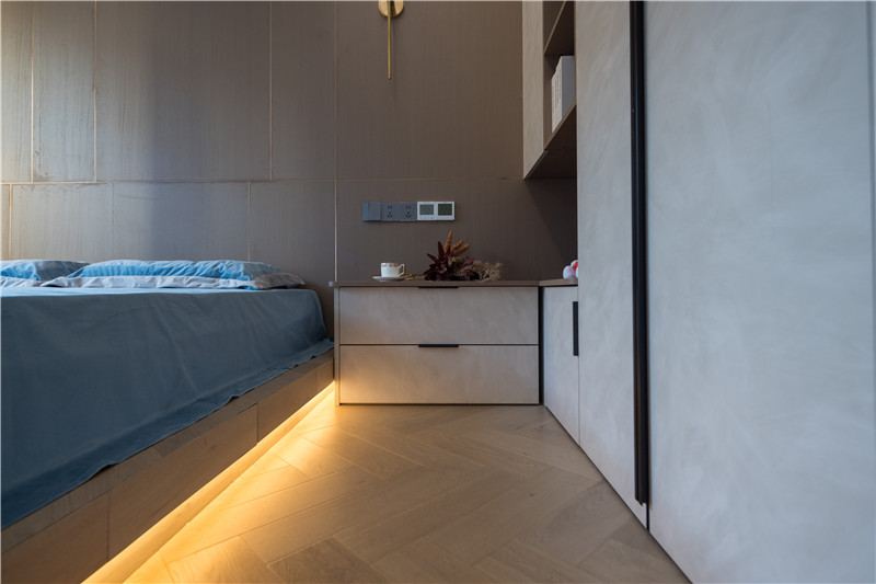 衣柜延伸以主臥的構(gòu)造,差異于延伸床頭柜,柜體科技直紋與水泥灰門板形成跳色,一體化設(shè)計和諧統(tǒng)一。