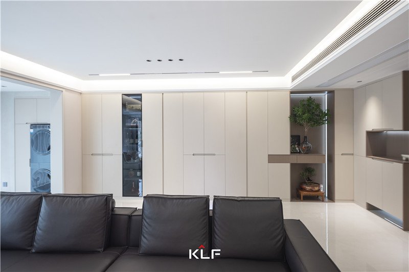 陽(yáng)臺(tái)洗烘一體式洗衣房,整體與沙發(fā)背景墻相協(xié)調(diào),分散家里的洗漱壓力。