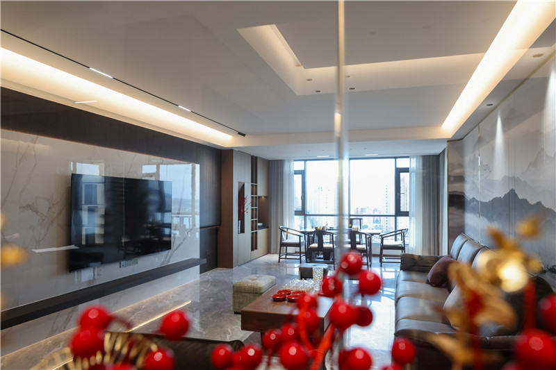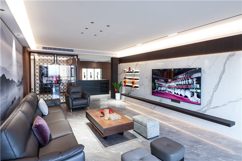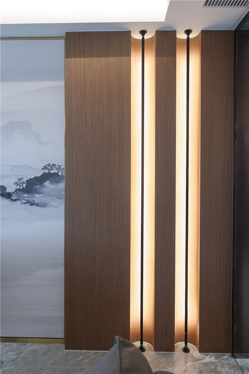 沙發(fā)背景墻采用整面水墨畫,其邊側(cè)以圓弧收邊,方圓間顯古雅風(fēng)韻。