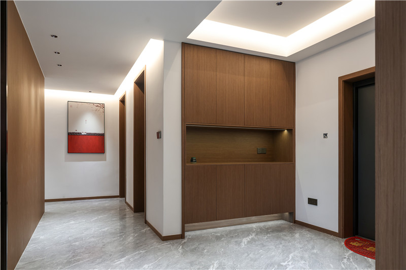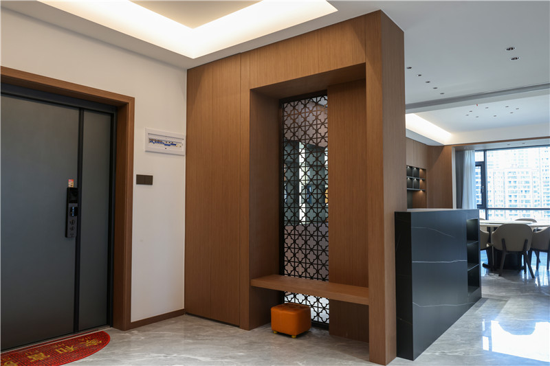 玄關(guān)處的設(shè)計(jì)讓人眼前一亮,柜子以客來(lái)福橡木展現(xiàn)中式設(shè)計(jì)的分量感。