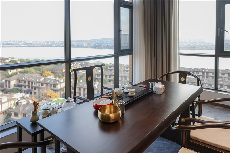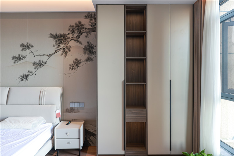 一側(cè)柜體為掛衣存儲(chǔ)區(qū),無(wú)拉手柜門協(xié)調(diào)視覺(jué)、休憩座緩解疲勞,背板加入中國(guó)結(jié)屏風(fēng)隔斷,中式意境突顯。