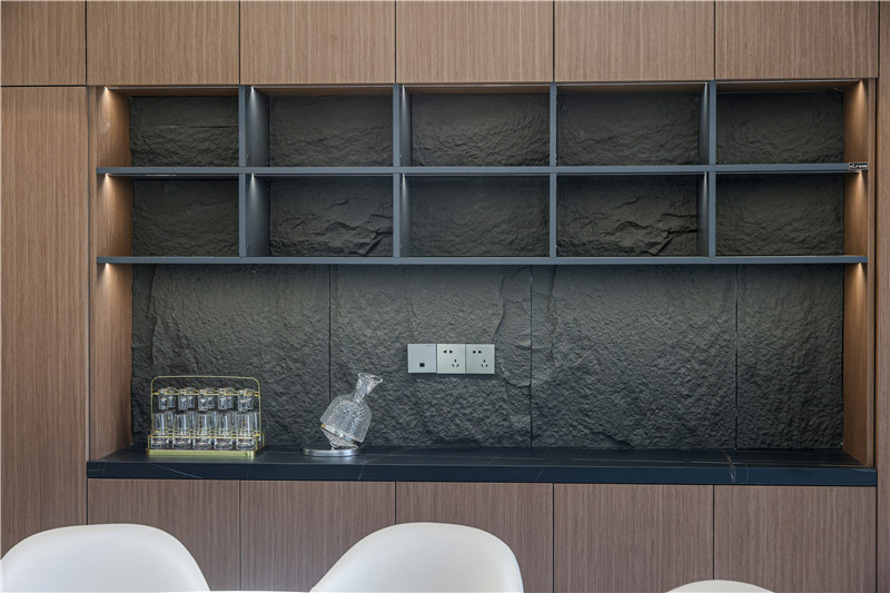 電視背景墻內(nèi)里整面木材拼接整塊大理石板,彰顯層次感;背景墻外嵌鋁板及整面木板,發(fā)揮收納桌及展示柜效用。