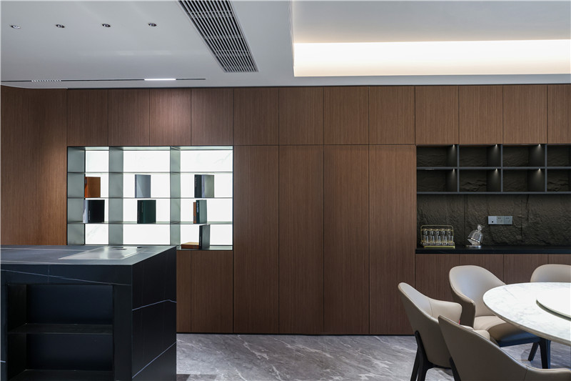 中西結(jié)合式餐廚空間,其餐廚背景墻整面柜體嵌入開放格,可做展示柜、酒柜使用。