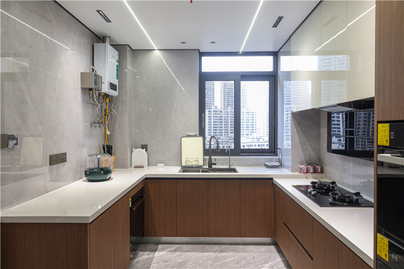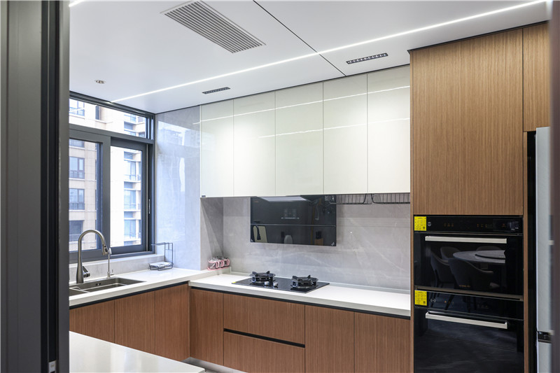 廚房客來(lái)福橡木柜體配合以巖板,溫馨柔潤(rùn),其整體U型構(gòu)造遵循智慧動(dòng)線,實(shí)用性強(qiáng);根據(jù)實(shí)際需求將烤箱等大電器嵌入地柜、高柜中,讓空間有效歸整。