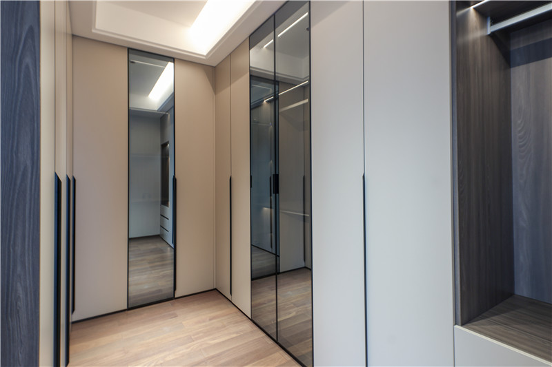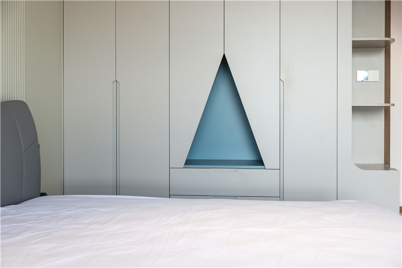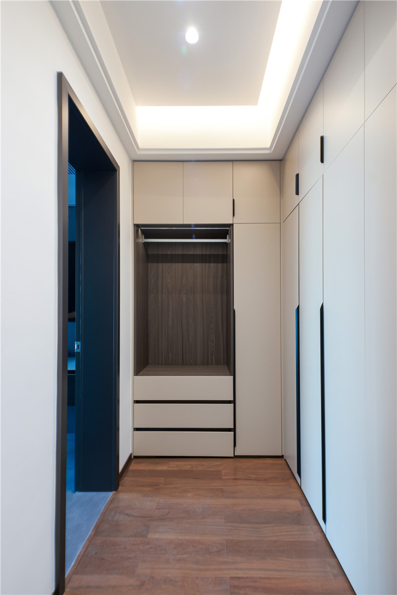 主臥內(nèi)有小型衣帽間,狹長(zhǎng)區(qū)域做到頂立柜,一側(cè)做掛疊結(jié)合區(qū)、一側(cè)做長(zhǎng)柜,有效保障多重收納與整潔需求。