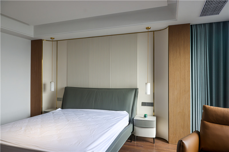 床頭整包嵌入墻體協(xié)調(diào)于整屋色調(diào),配合以細(xì)節(jié)處燈光,妥妥溫居;靠窗多功能收納柜,頂天立地式結(jié)構(gòu)中和收納和裝飾功能。