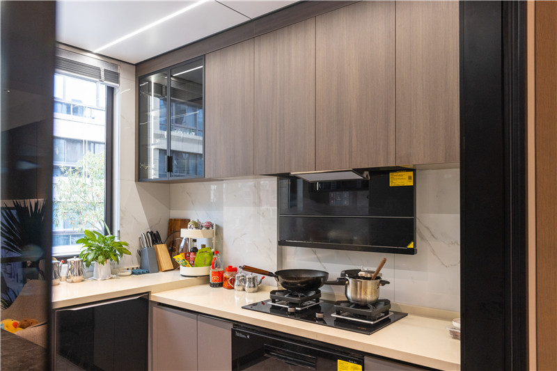 廚房主要以實(shí)用功能為主,將空間利用至理想化。U型布局擁有強(qiáng)大的收納儲(chǔ)物能力,將大型廚電內(nèi)嵌置櫥柜中,減輕客廳收納壓力,做飯也變得更便利。