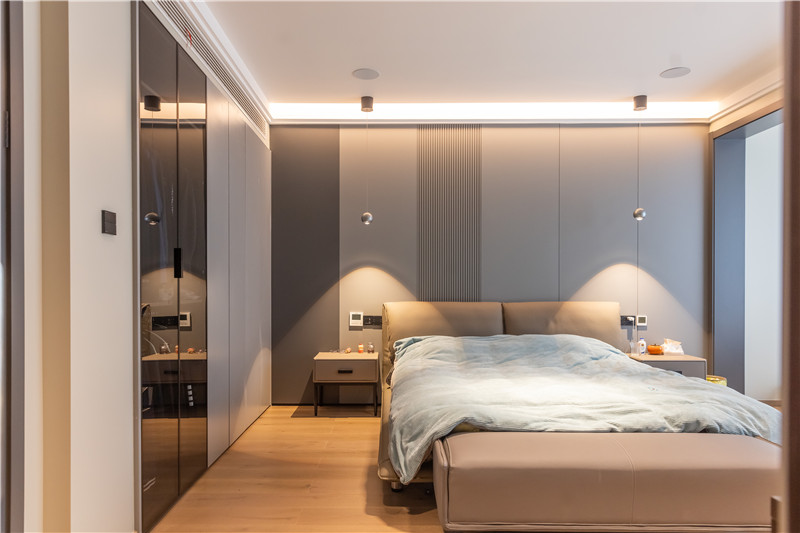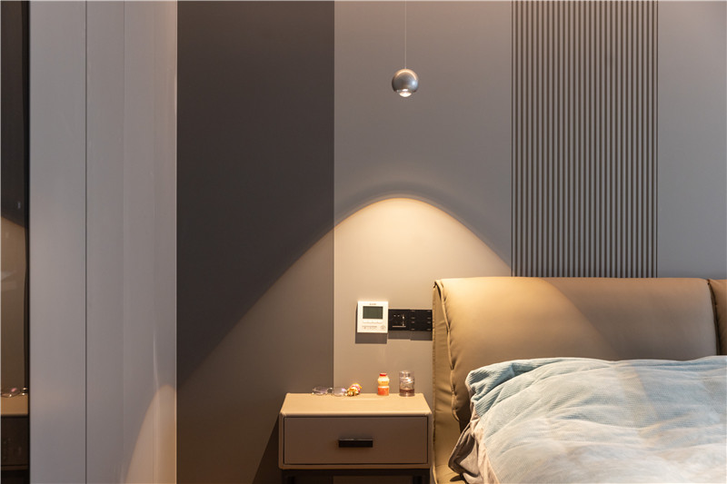 臥室設(shè)計(jì)整體風(fēng)格溫馨舒適,空間色系更加溫和;無(wú)主燈設(shè)計(jì)使得屋內(nèi)簡(jiǎn)約開(kāi)闊;床頭背景墻拼接+格柵,時(shí)尚又充滿(mǎn)設(shè)計(jì)感。