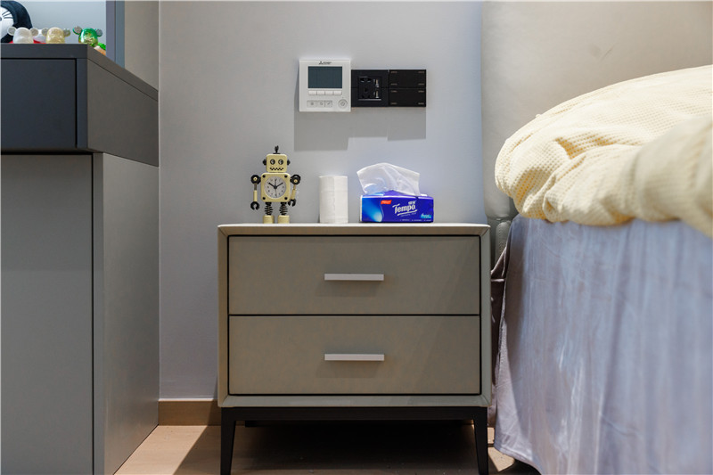 該臥室設(shè)計(jì)中部不規(guī)則開(kāi)放柜,放置日常玩偶、手辦、模型等收藏品,符合使用者所需,同時(shí)為衣柜增加了精致與顏值。