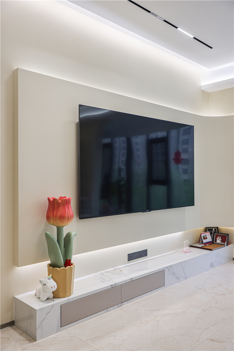 懸浮電視背景墻上延續(xù)弧形設(shè)計
