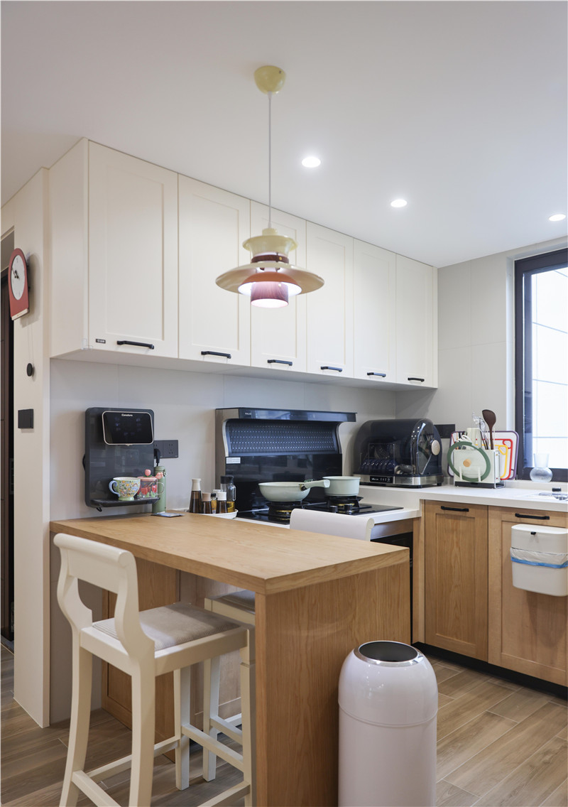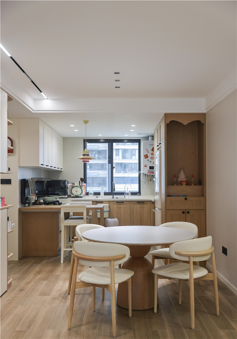 北歐橡木地柜帶有濃郁自然氣息的木作肌理,在空間中流露出精妙變化,與溫潤(rùn)內(nèi)斂的芬蘭白吊柜形成視覺反差,豐富的空間層次讓四方食事更具質(zhì)感。