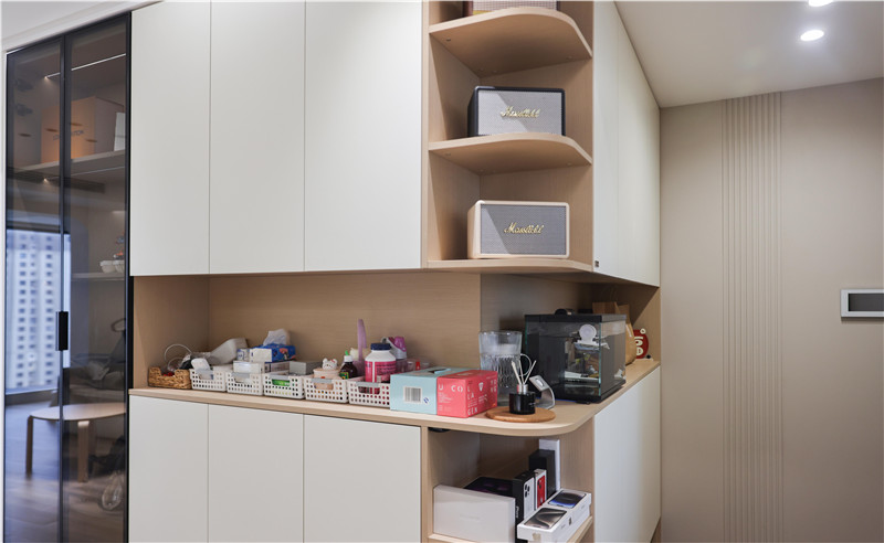 與玄關(guān)過渡區(qū)域的組合柜,采用內(nèi)斂矜貴的芬蘭白柜面,彰顯現(xiàn)代質(zhì)感。北歐直紋的開放格,原木色為空間注入肆意流淌的自然氣息。