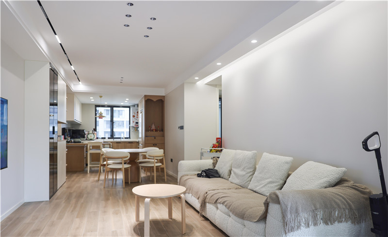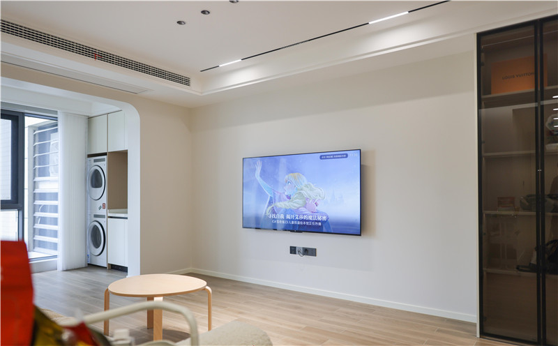 客廳區(qū)域以輕盈美學(xué)示人,避免蕪雜色彩和沉重結(jié)構(gòu)。兩處背景墻均采用純白墻面,通透布局疊加純凈色調(diào),營(yíng)造明凈曠達(dá)的視覺感受。